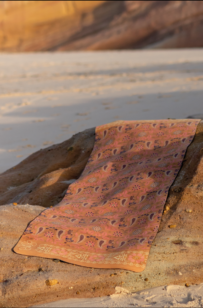 composition : base en caoutchouc naturel éco-friendly (dessous); couverture en microfibre recyclée (dessus); encres à l’eau (processus plus écologique, sans chlore).